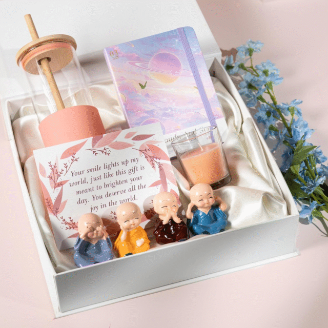 With its cute Buddha monks, aromatic candle, diary, greeting card, and the handy silicon sipper, this hamper becomes more than a gift — it becomes a memory your loved one will cherish.